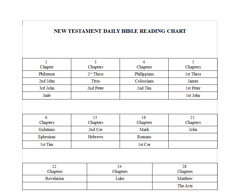 As you can see, we are reading the books according to the number of chapters they have, from the least to the greatest. You will move quickly through the small books and this will encourage you to continue.